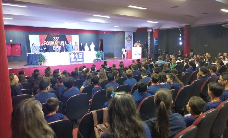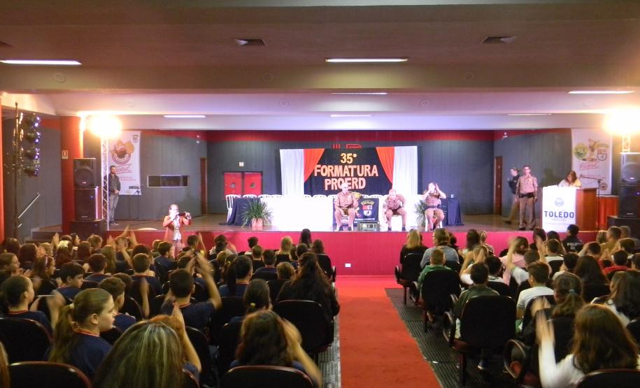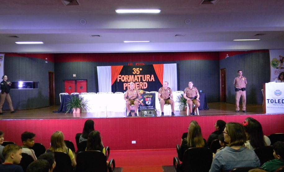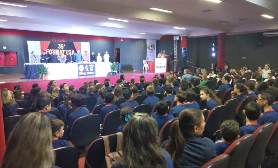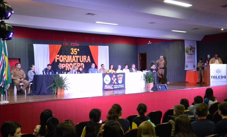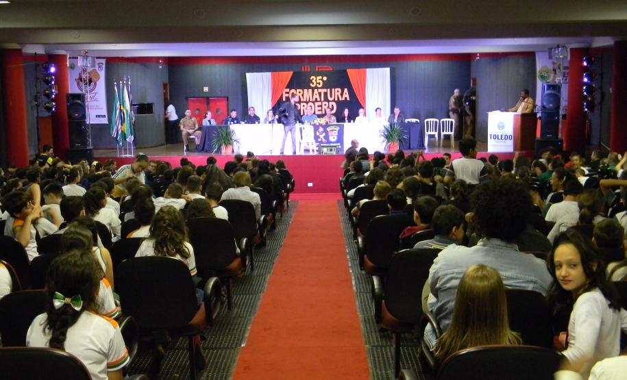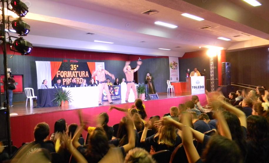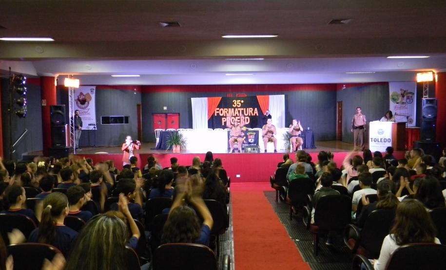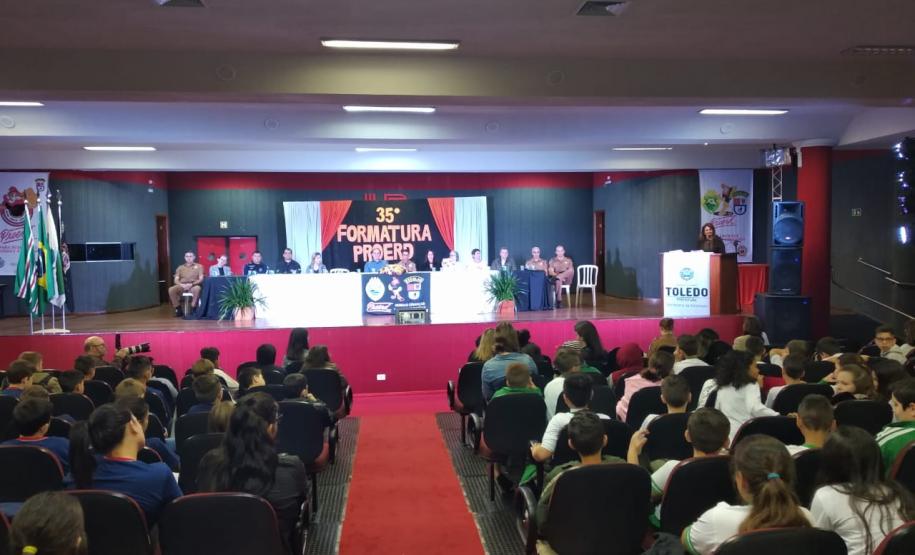 Nessa quarta-feira dia 26 de junho, no auditório da Universidade Paranaense de Toledo, ocorreu a 35ª cerimônia de formatura do Programa Educacional de Resistência à Drogas e à Violência. O evento reuniu turmas do 5º ano de diversas escolas municipais de Toledo, com a presença de autoridades como o Prefeito Municipal Lucio de Marchi, a Secretária Municipal de Educação Edna Heloisa Schaeffer Amaral, a Vereadora Janice Salvador, autoridades do Judiciário, do Legislativo, representantes da Polícia Civil, do Núcleo Regional de Educação, da Delegacia de Mulheres, além de todo o Corpo Militar do 19º Batalhão de Polícia Militar de Toledo.