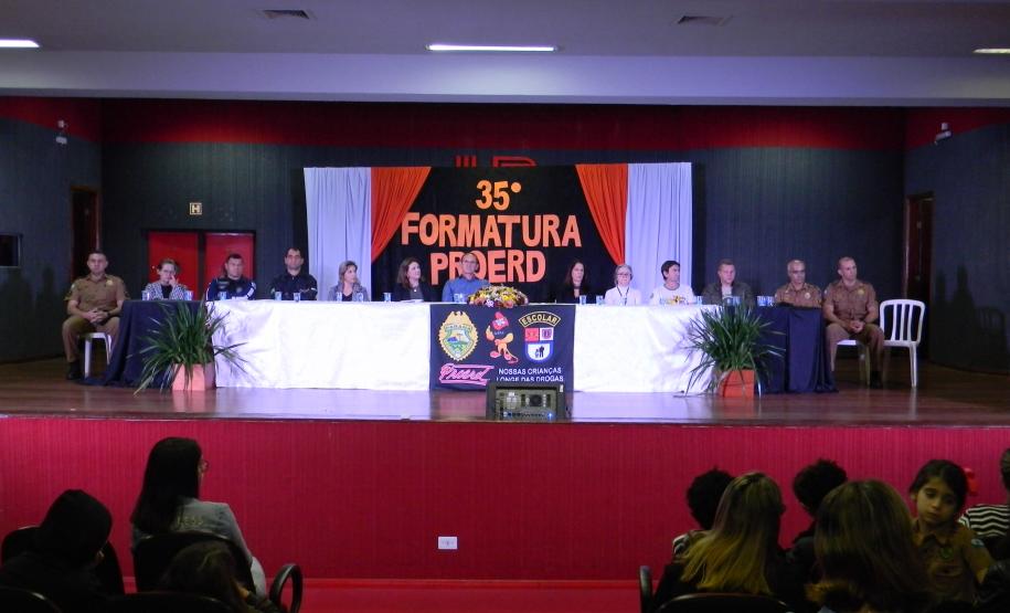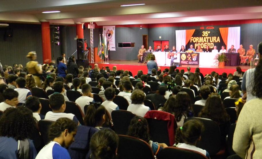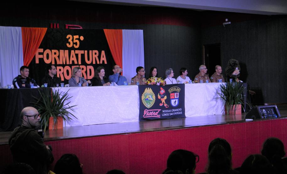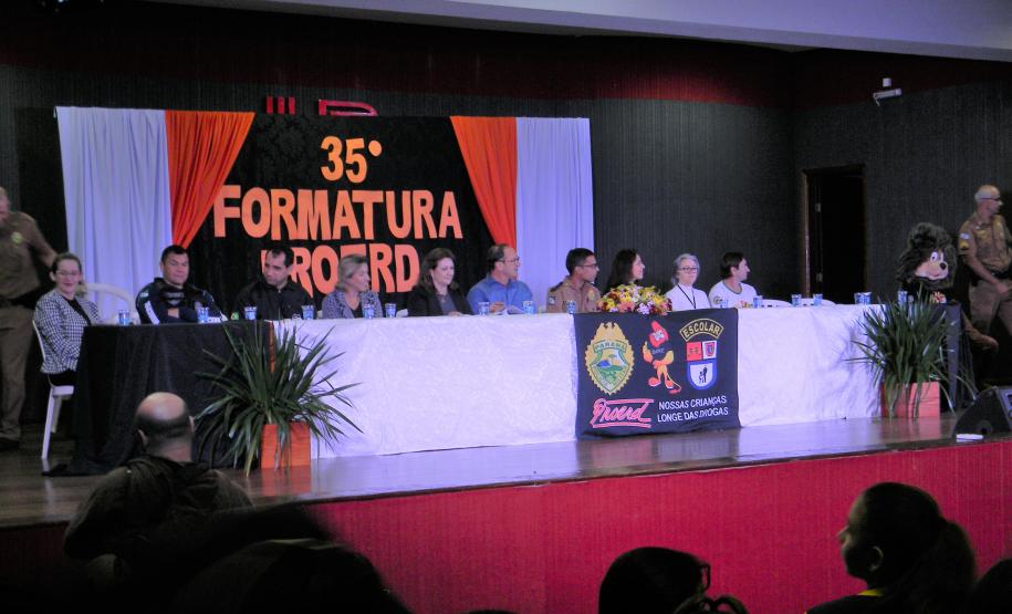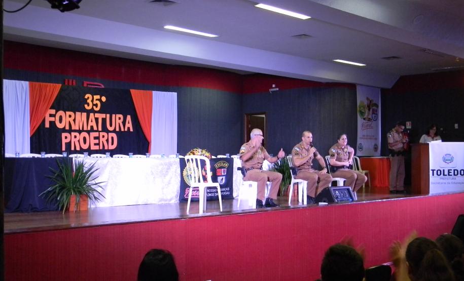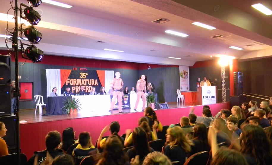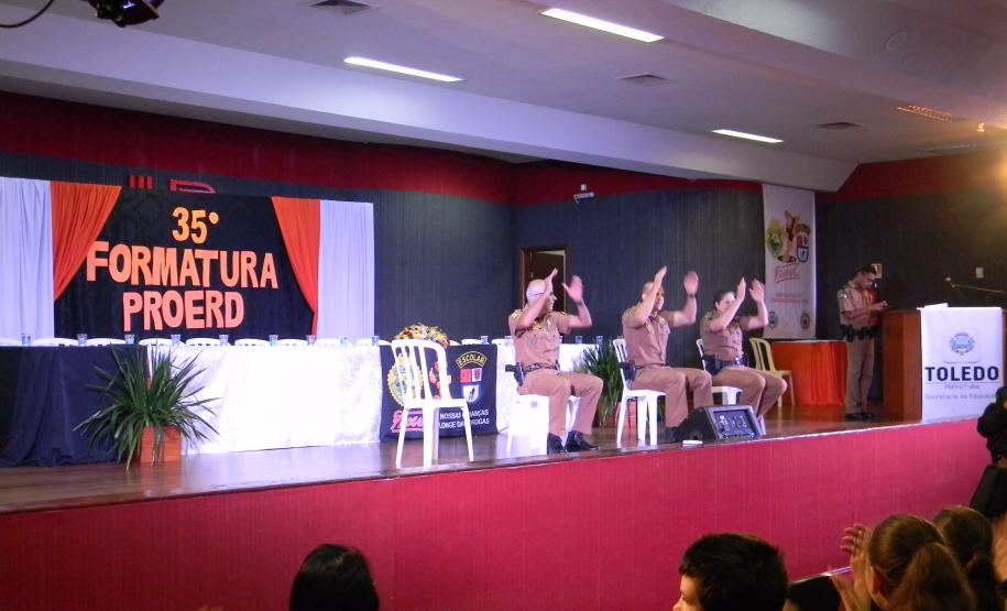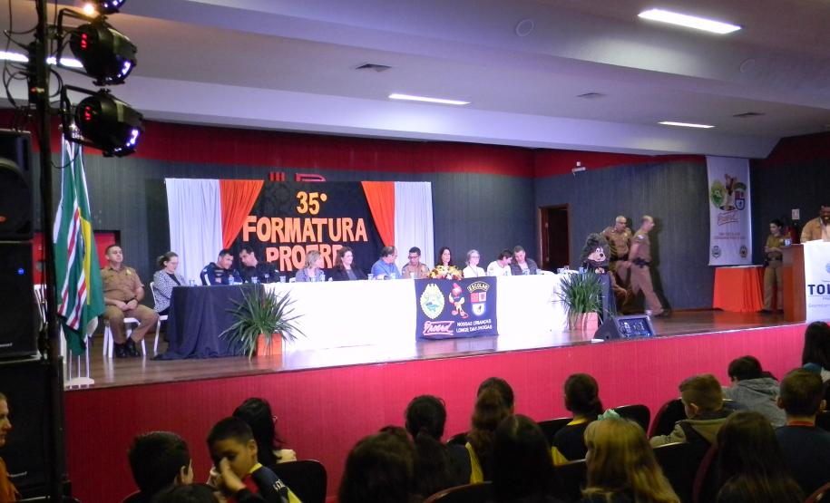 Nessa quarta-feira dia 26 de junho, no auditório da Universidade Paranaense de Toledo, ocorreu a 35ª cerimônia de formatura do Programa Educacional de Resistência à Drogas e à Violência. O evento reuniu turmas do 5º ano de diversas escolas municipais de Toledo, com a presença de autoridades como o Prefeito Municipal Lucio de Marchi, a Secretária Municipal de Educação Edna Heloisa Schaeffer Amaral, a Vereadora Janice Salvador, autoridades do Judiciário, do Legislativo, representantes da Polícia Civil, do Núcleo Regional de Educação, da Delegacia de Mulheres, além de todo o Corpo Militar do 19º Batalhão de Polícia Militar de Toledo.