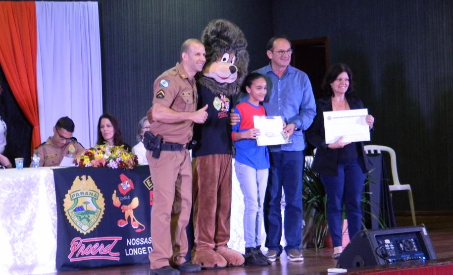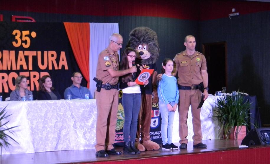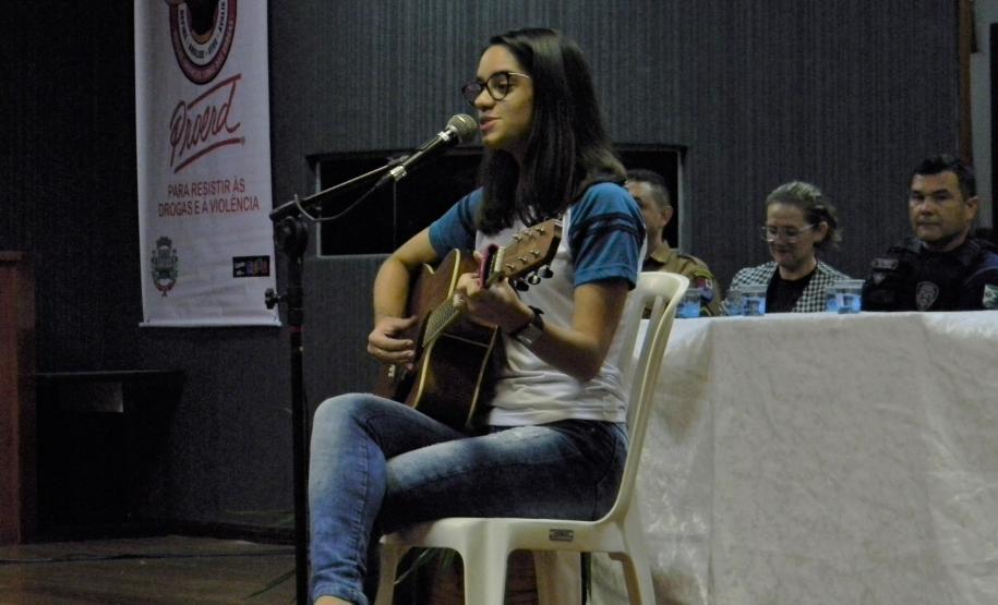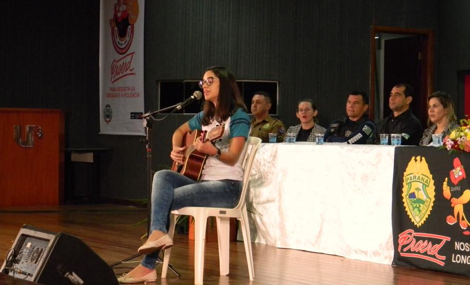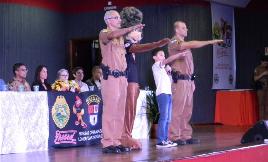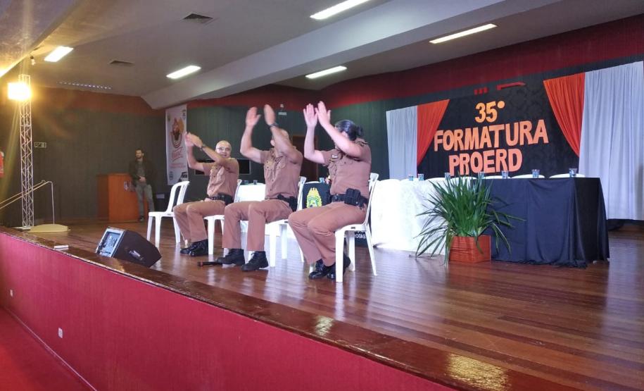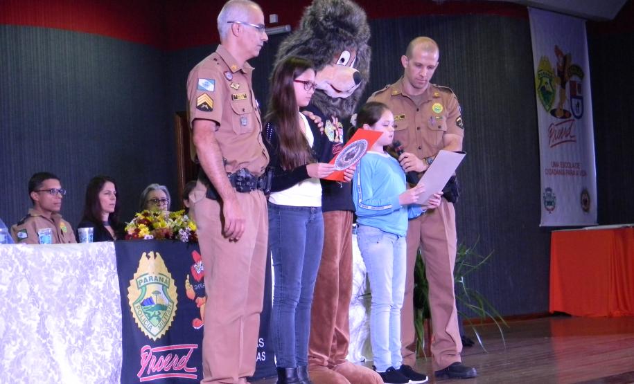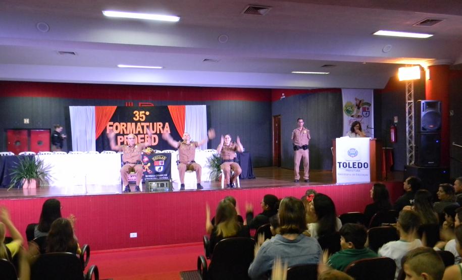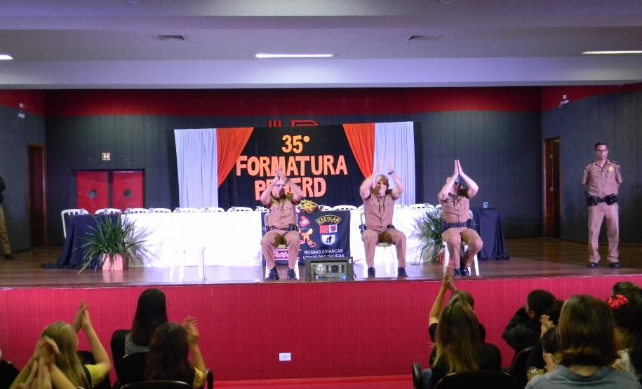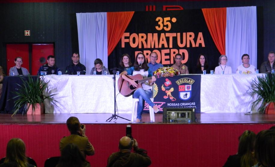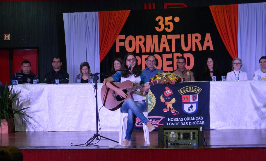 Com direito a apresentação artística em homenagem aos professores, a aluna Gabriele Costa interpretou com voz e violão a música “Trem Bala”, composição de Ana Carolina, que contagiou os alunos. Houve ainda apresentação de composições textuais dos alunos ressaltando o aprendizado com o curso. O evento também foi conduzido com danças e canções específicas do programa realizado com as crianças, as quais motivaram ainda mais a cerimônia, com a orientação dos policiais e instrutores do programa Marques e Marcante.