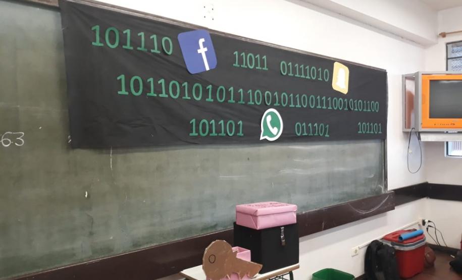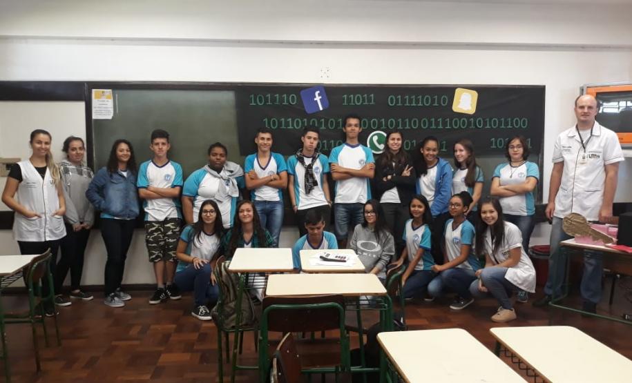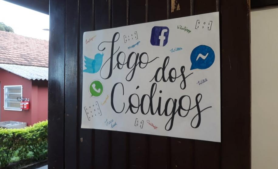 Os acadêmicos Tayssa (6º período), Jéssica (5º período) e Maicon (6º período) desenvolveram a oficina de Jogos dos Códigos aplicado no 3º A matutino: