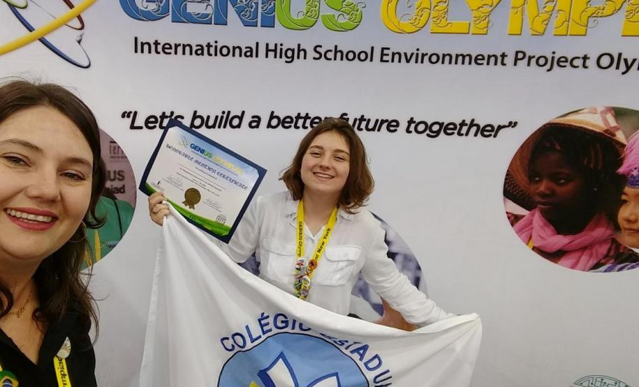 A aluna Julia Coppini Schuch, do Colégio Estadual Jardim Porto Alegre, conquistou a Menção Honrosa na Genius Olympiad em Oswego, Nova York, por seu trabalho de pesquisa científica denominado “Uso de diferentes concentrações de extratos vegetais no controle do fungo Puccinia Psidii Winter em Myrciaria Cauliflora fase III”.