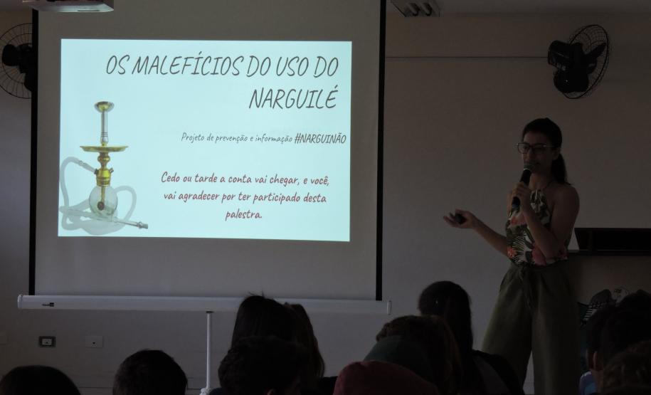 A palestrante falou ainda sobre a moda do narguilé, que é aderida por hobby entre os jovens, sem as informações e atenção necessárias. Que assim como o cigarro iniciou sem estudos e alerta adequado a população, assim está sendo disseminado uma cultura do uso do narguilé sem a conscientização e o cuidado com a saúde da população.