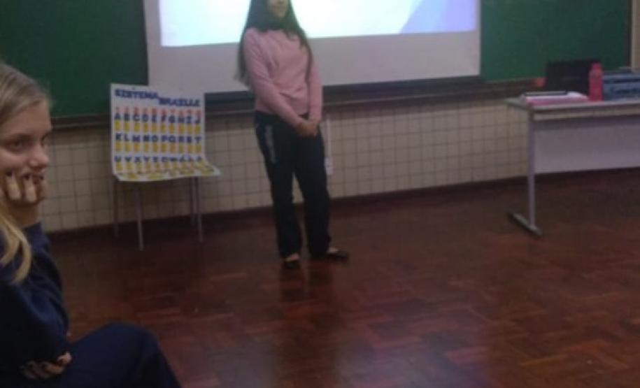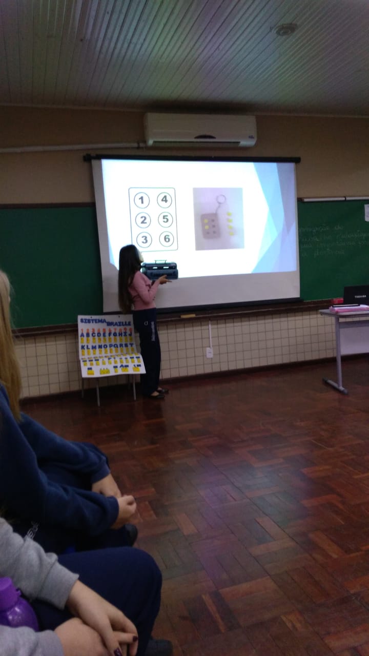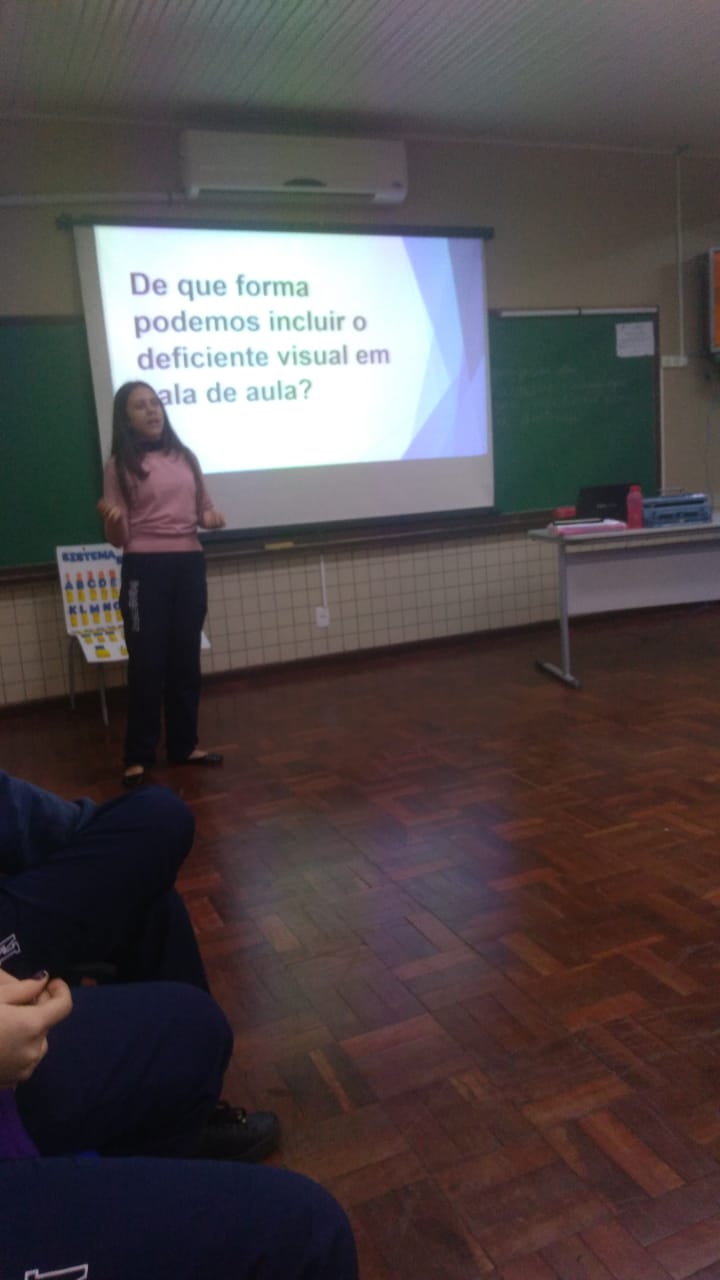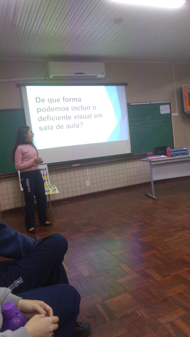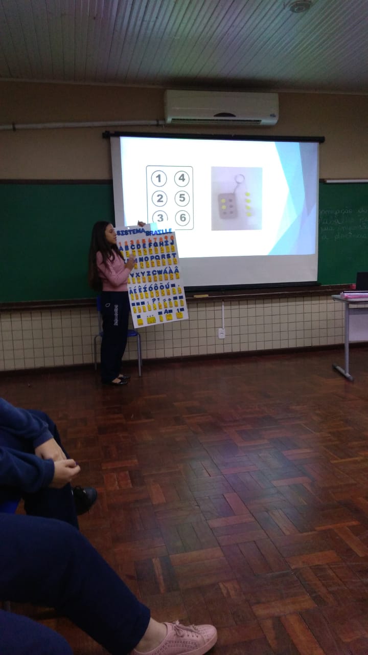 No dia dois de setembro, a aluna Endy Gabriela Vorpagel da Silveira do Colégio Estadual Eron Domingues apresentou para os alunos do 2ª ano do Curso Técnico Formação de Docentes a palestra com o tema: Baixa Visão e Cegueira. O objetivo foi trabalhar conceitos sobre os temas, a inclusão escolar, os diferentes materiais utilizados em sala de aula como o Sistema Braille, a utilização da máquina em Braille e o Sorobã.