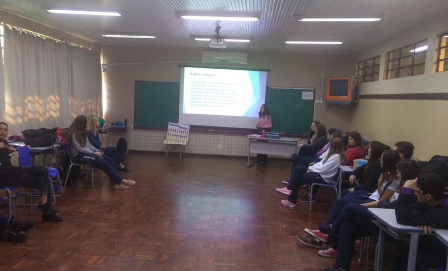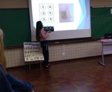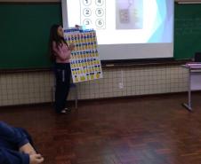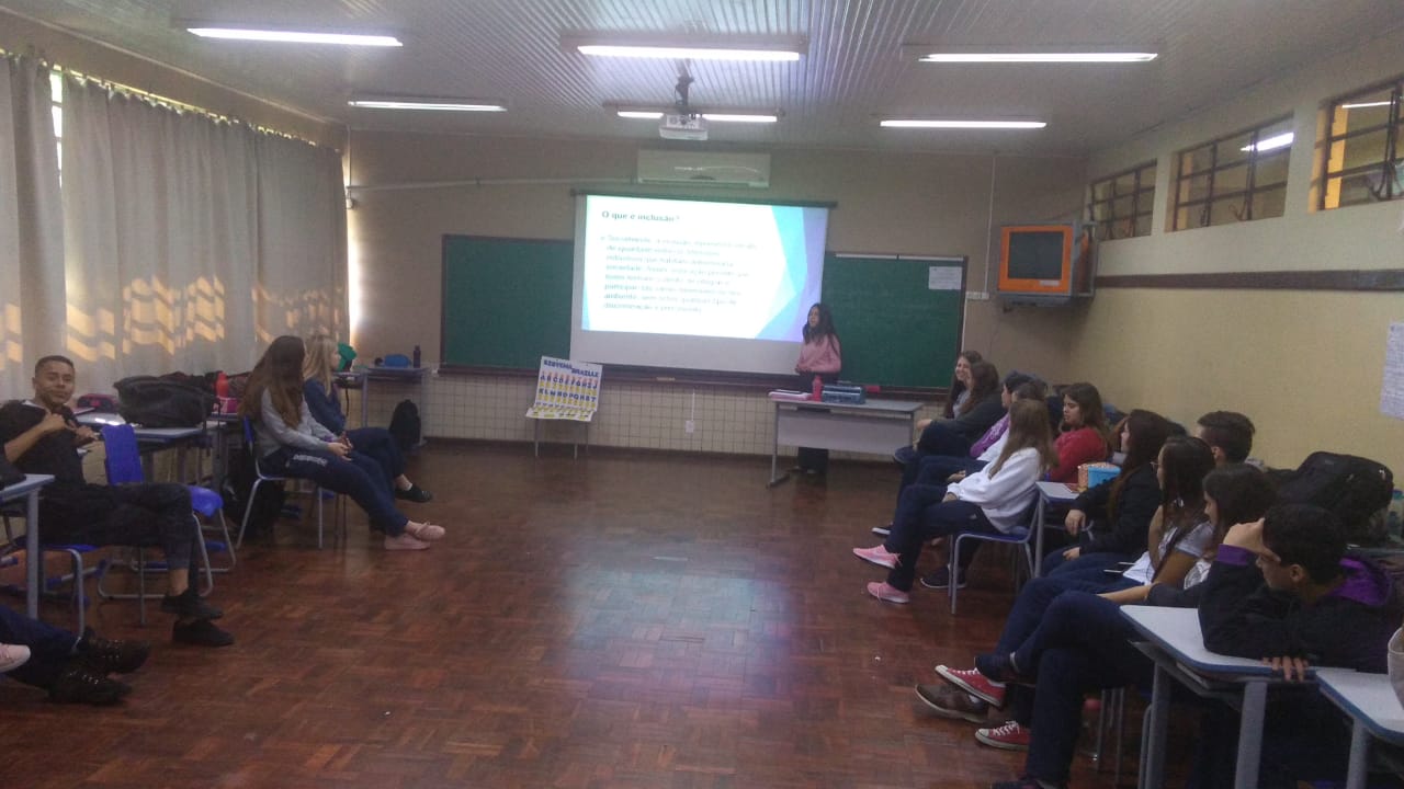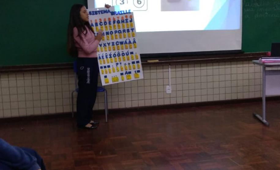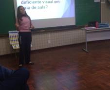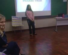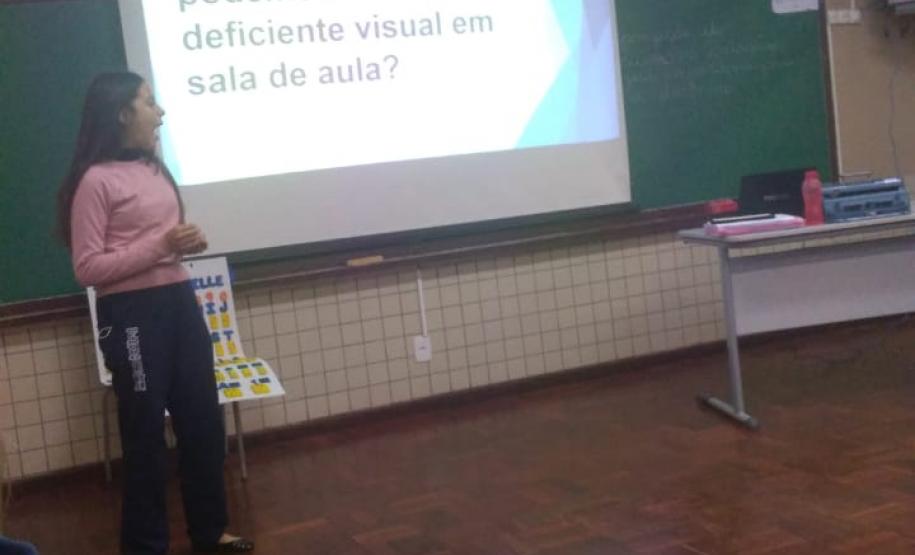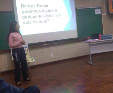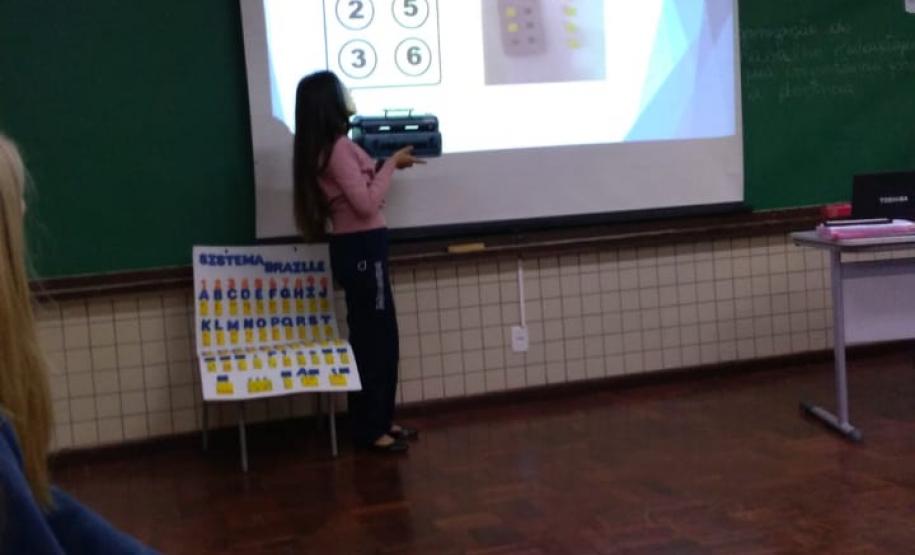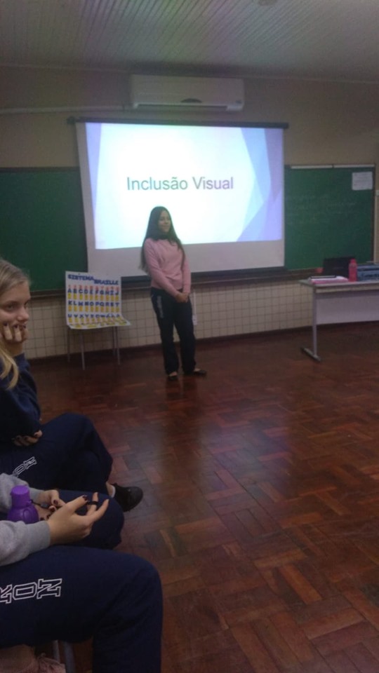 No dia dois de setembro, a aluna Endy Gabriela Vorpagel da Silveira do Colégio Estadual Eron Domingues apresentou para os alunos do 2ª ano do Curso Técnico Formação de Docentes a palestra com o tema: Baixa Visão e Cegueira. O objetivo foi trabalhar conceitos sobre os temas, a inclusão escolar, os diferentes materiais utilizados em sala de aula como o Sistema Braille, a utilização da máquina em Braille e o Sorobã.