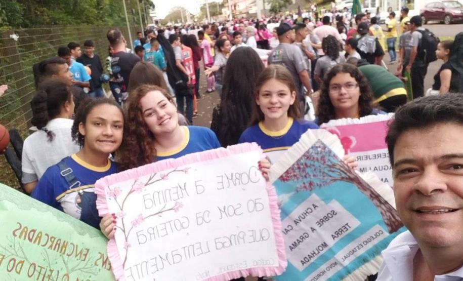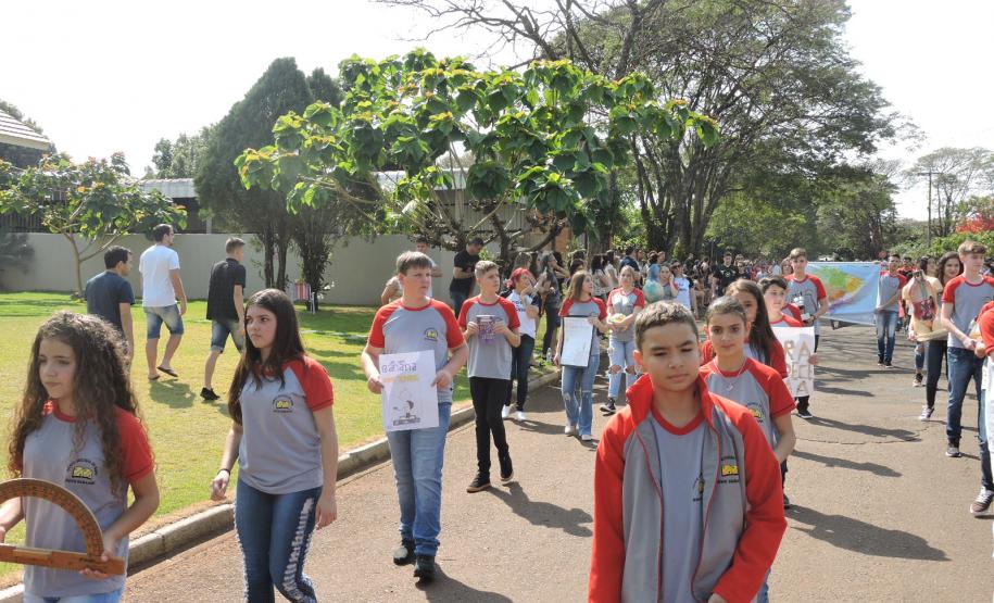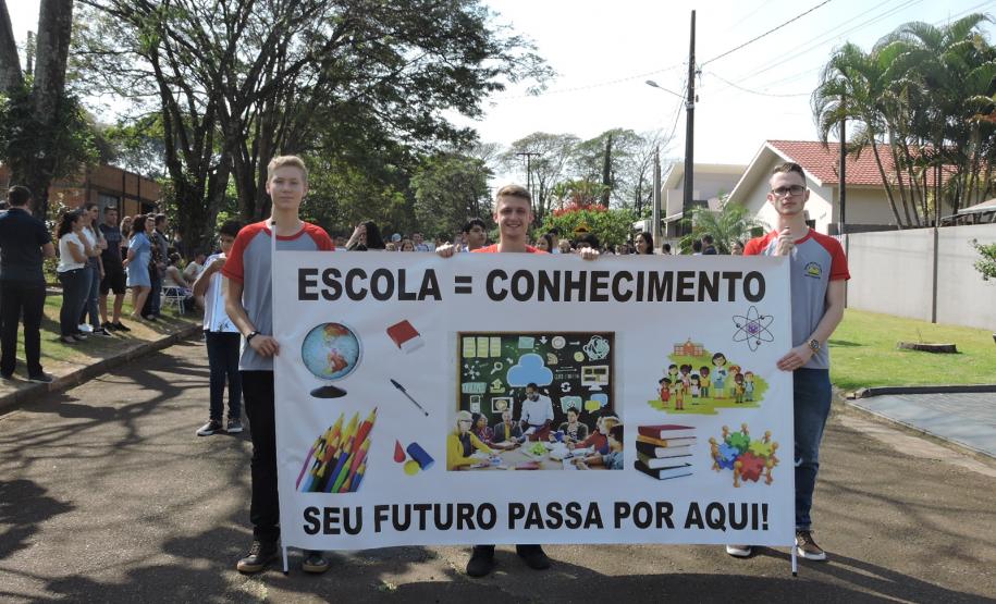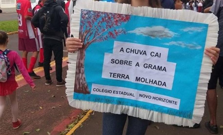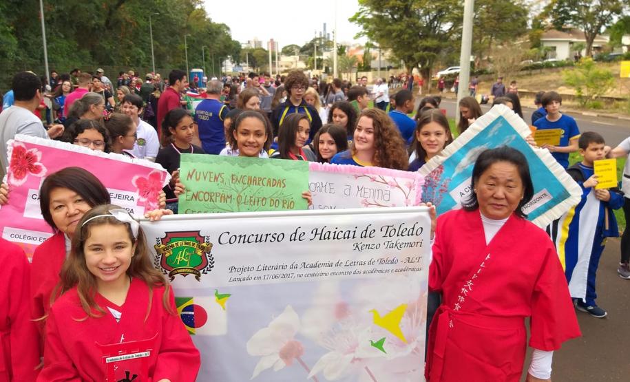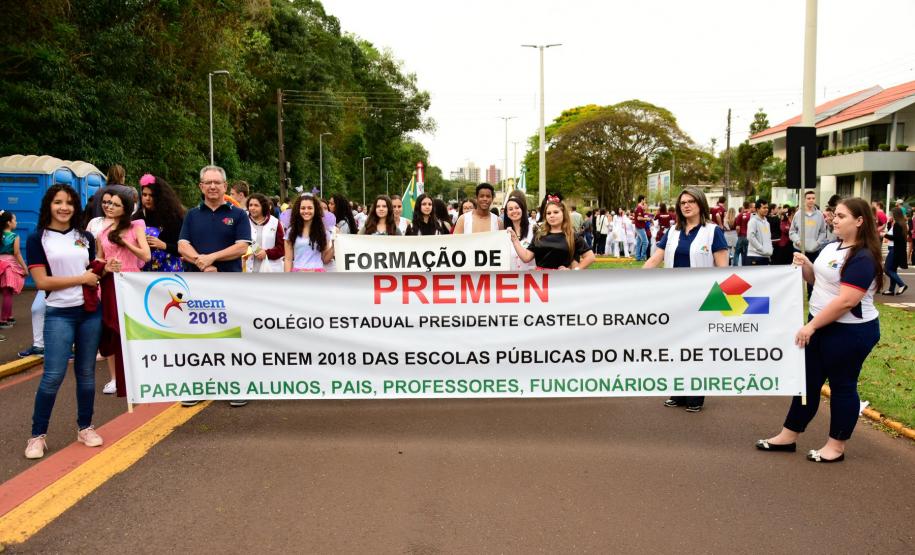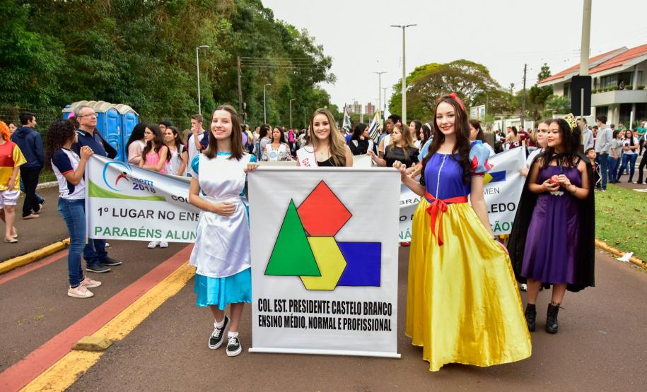 Já a Direção e alunos do Colégio Estadual Presidente Castelo Branco organizaram banners da instituição e dos cursos técnicos para o Desfile do dia 07 de setembro no Lago Municipal, destacando o excelente desempenho dos alunos da instituição no ENEM 2018, o que culminou no título de 1º lugar no Enem dentre as Escolas Públicas do Núcleo Regional de Educação de Toledo. Por sua vez, as alunas do Colégio Estadual Novo Horizonte, participantes do Concurso de Haicai de Toledo premiadas pela Academia de Letras desfilaram com cartazes das poesias integrantes no concurso. E os alunos da Escola Do Campo de Vila Ipiranga realizaram apresentações sob orientação da professora de História Leonice Schneider, onde destacaram o processo histórico da Independência brasileira relacionando as questões sociais e políticas atuais.