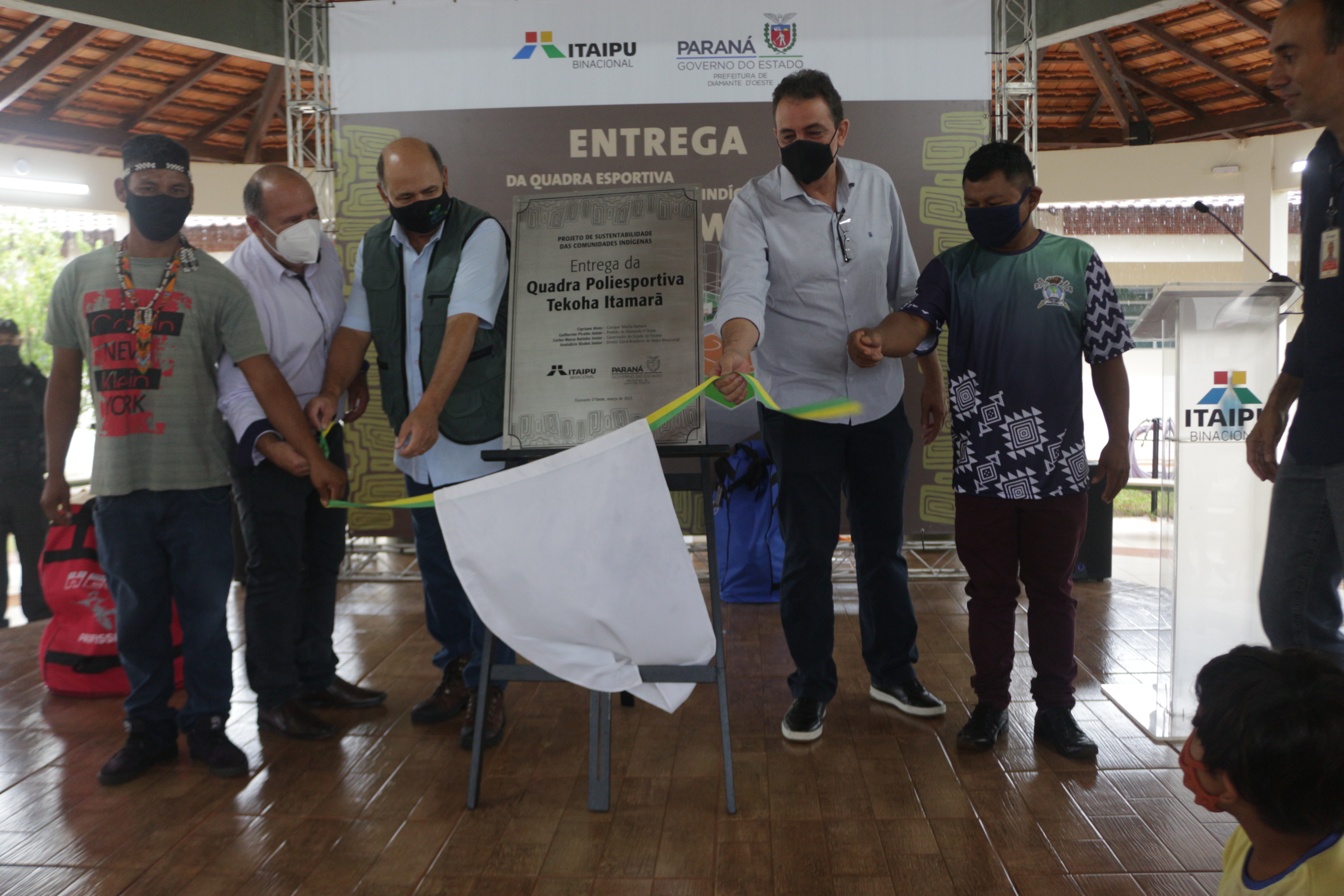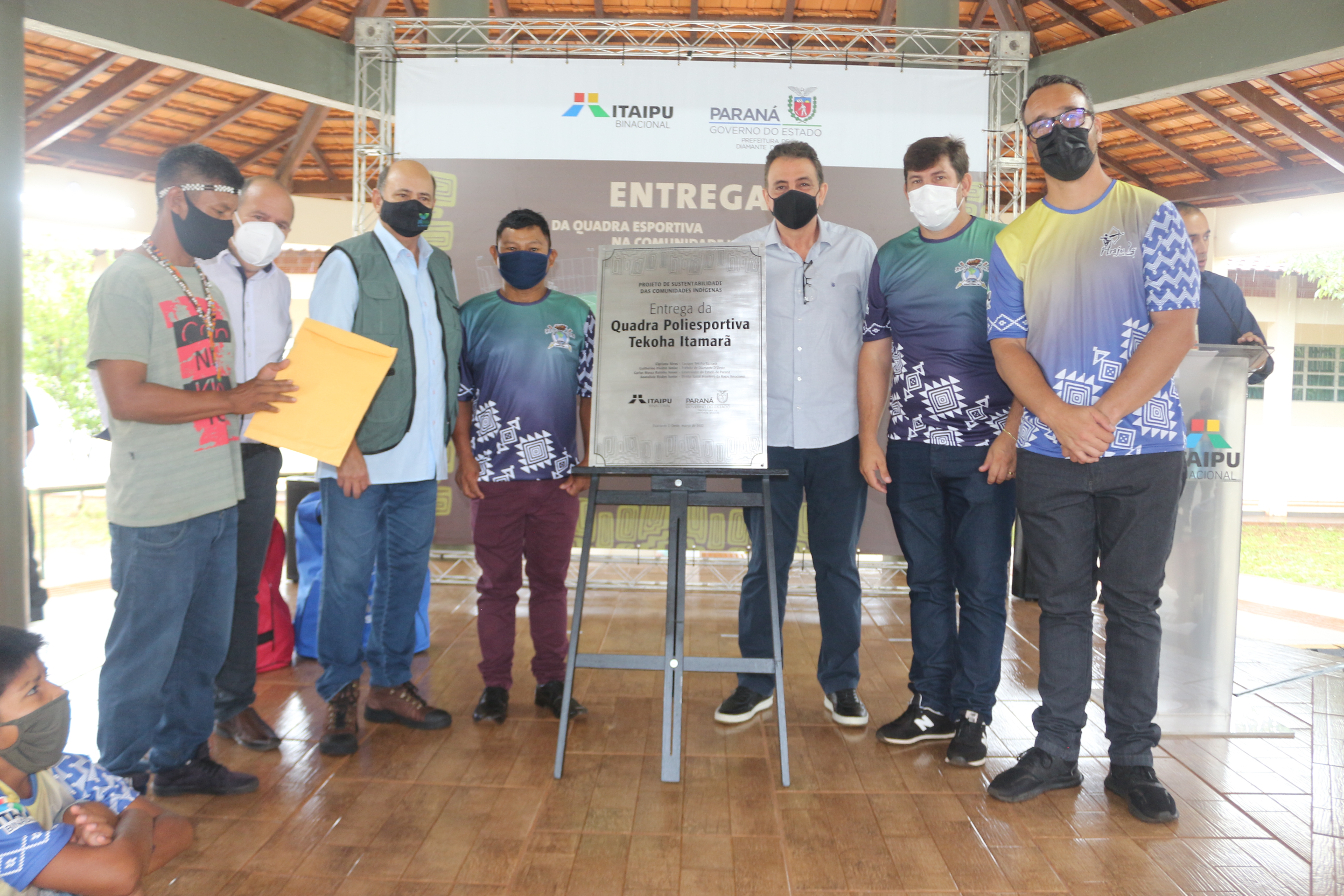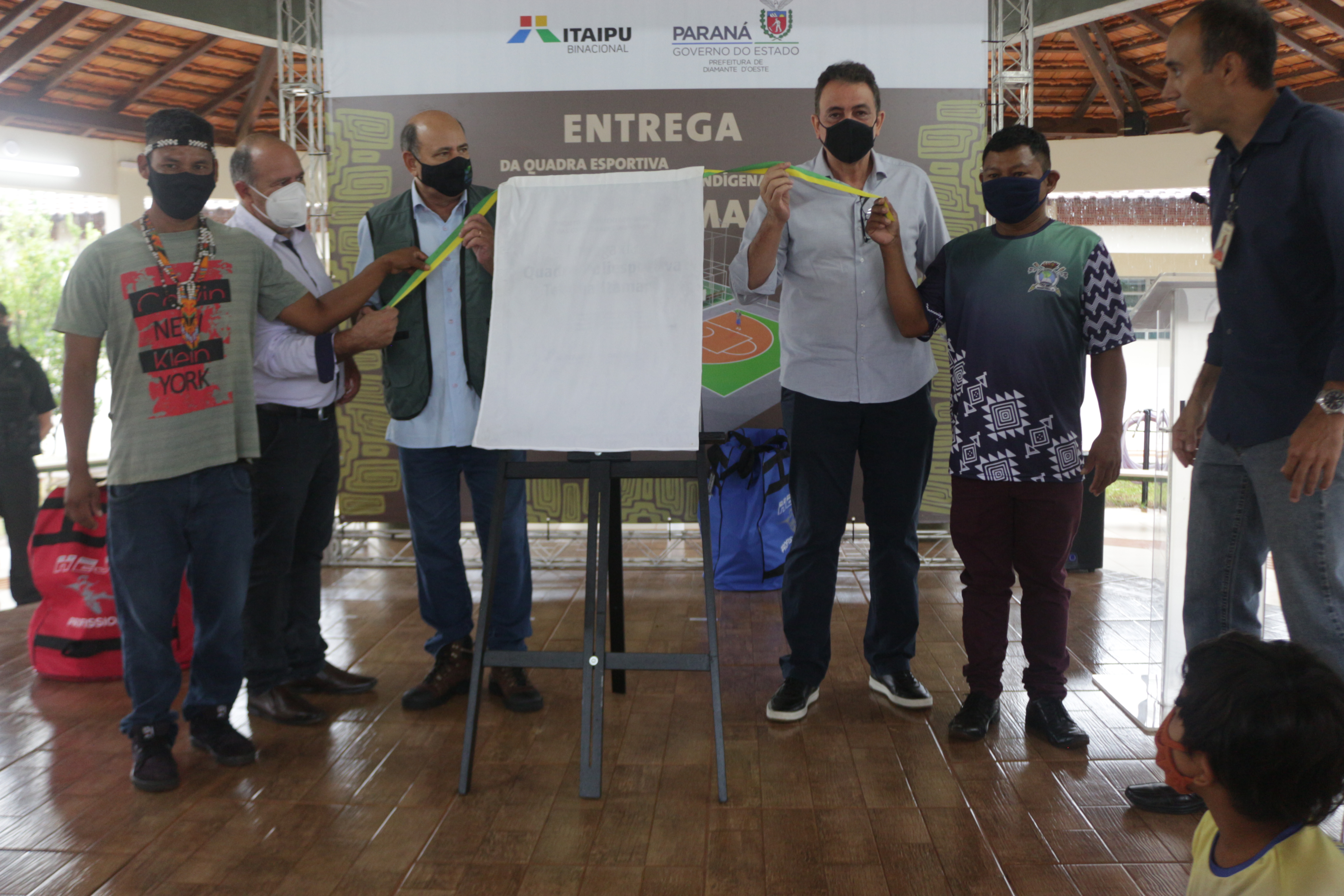 Na última sexta-feira (11) aconteceu na Escola Estadual Indígena Araju Porã em Diamante D’Oeste a cerimônia de entrega da Quadra Poliesportivo para Comunidade e Kits Esportivos, composto por bolas, bombas de ar e cones de treinamento. A cerimônia contou com presença do diretor de Coordenação da binacional, general Luiz Felipe Carbonell, representando o diretor-geral brasileiro, almirante Anatalicio Risden Junior; do prefeito de Diamante D’Oeste, Guilherme Pivatto Junior; do chefe do Núcleo Regional de Educação de Toledo, José Carlos Pereira Guimarães, representando o Secretário de Educação e Esportes, Renato Feder; caciques e membros das duas comunidades.