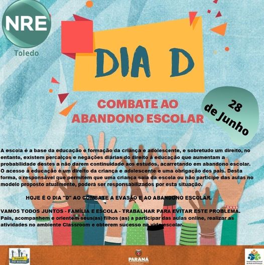 O dia D foi idealizado para reforçar e incentivar as ações que já vem sendo realizadas pelas escolas do Núcleo Regional de Educação de Toledo, proporcionando nas escolas um dia exclusivo para as ações de resgate de estudantes em situação de abandono escolar, a fim de garantir a todos o direito de acesso à Educação.