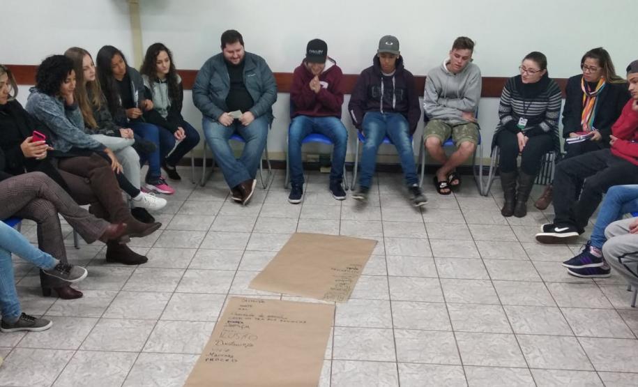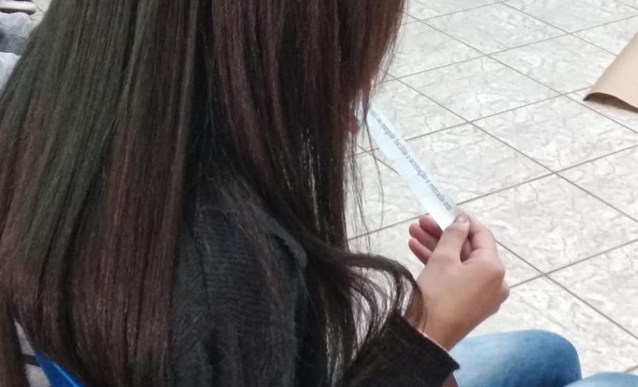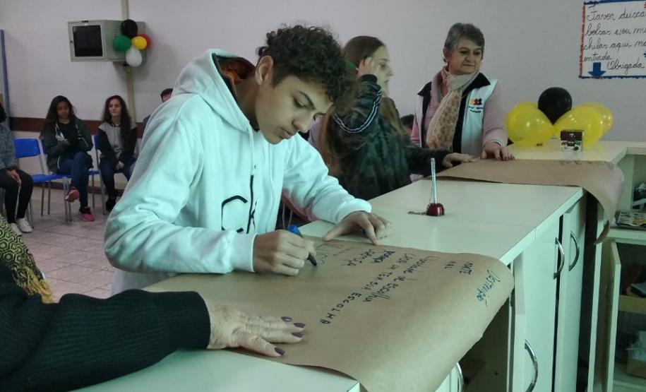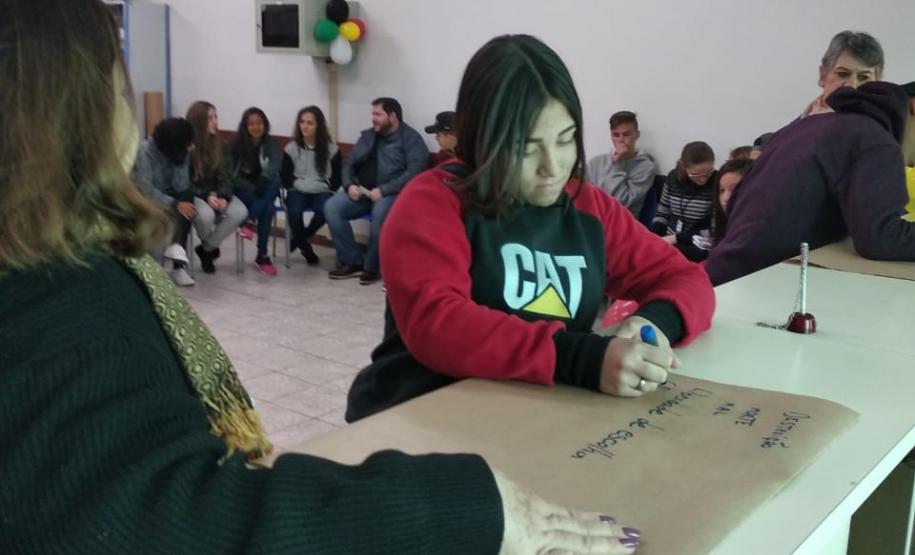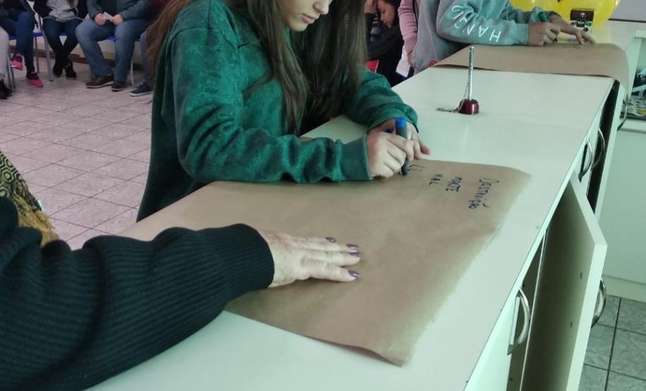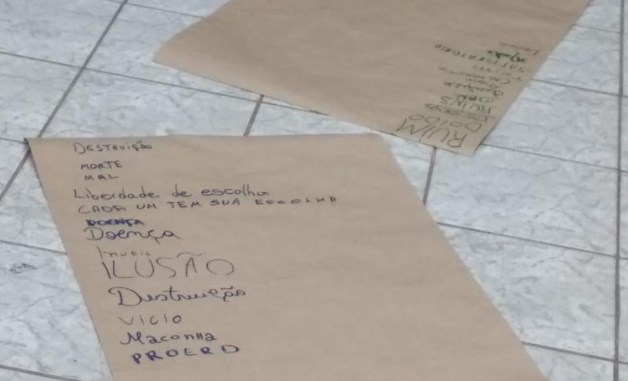 Nessa roda de conversa, a professora Marcia Regina Refosco e a Coordenadora Simone da Regional de Saúde, conduziram as atividades através da estratégia de pedir aos alunos que escrevessem em papel pardo palavras ou frases que vem à mente quando citado o tema drogas. A partir dessas palavras e frases então, as mesmas introduziram-nos as conversas a partir do concordo e discordo, fazendo-os explicar o motivo do posicionamento, suas opiniões e experiências. A conversa é aberta com apenas a regra de respeitar o que estiver de posse da palavra, sem julgamentos e preconceitos.